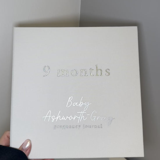 A linen pregnancy journal. This gorgeous journal allows mothers-to-be to chart their personal experience of pregnancy. The beautifully white linen cover features a woven finish, complete with ‘9 months – pregnancy journal’ decal in silver debossed lettering. Inside are numerous pages in which to track changes and events throughout pregnancy, including space for scans, photos, dates and personal notes.