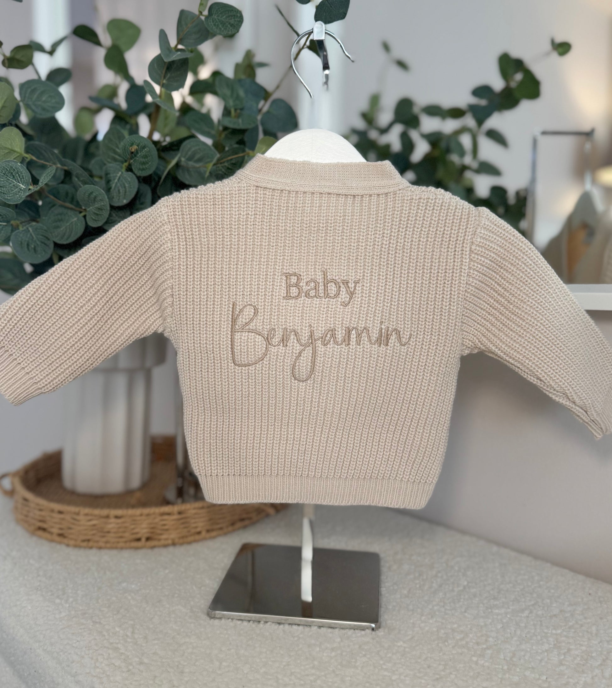 Our knitted baby cardigans are now personalised with delicate embroidery 🤍