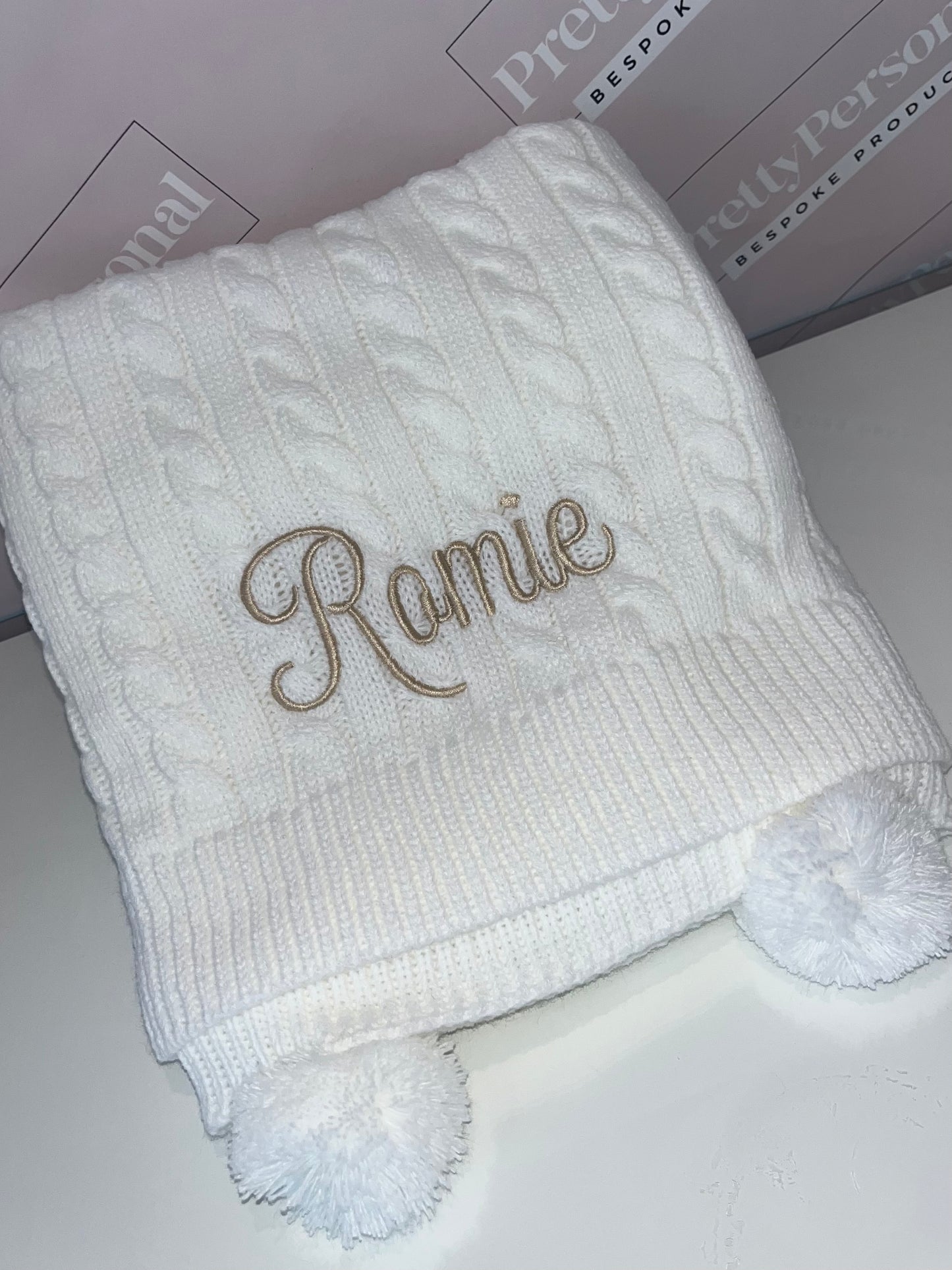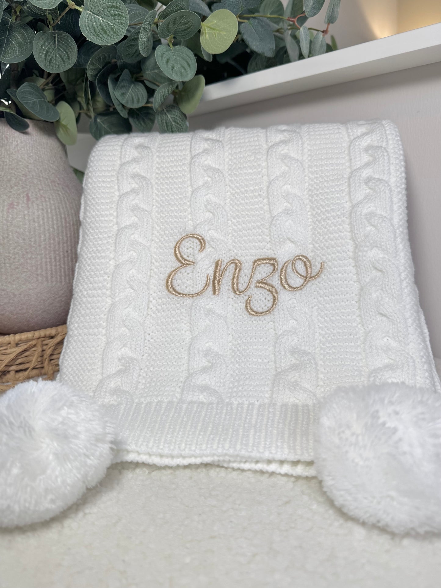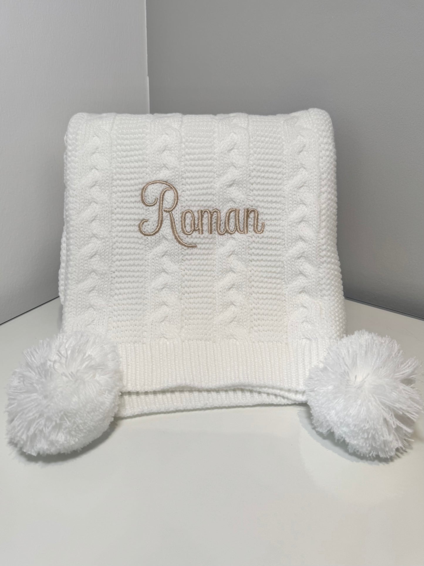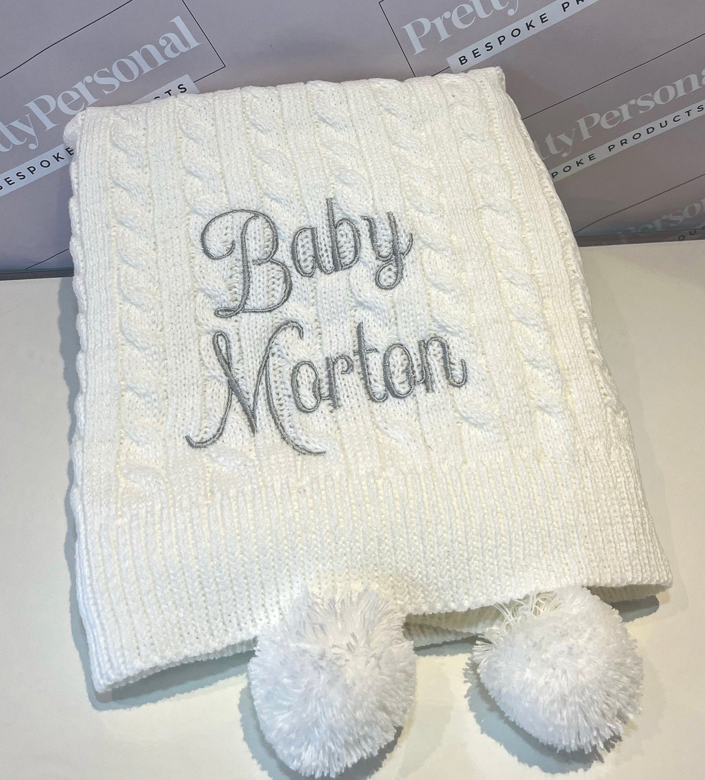Introducing our luxury cable knit baby blanket, personalised for that extra special touch. This luxurious blanket comes in 6 stunning shades with matching poms and a complimenting thread colour. Super soft and perfect for the colder weather.