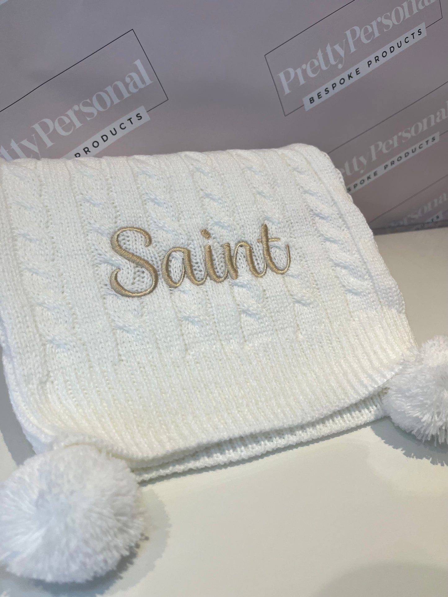 Personalised Double Pom Pom Knitted Blanket - White