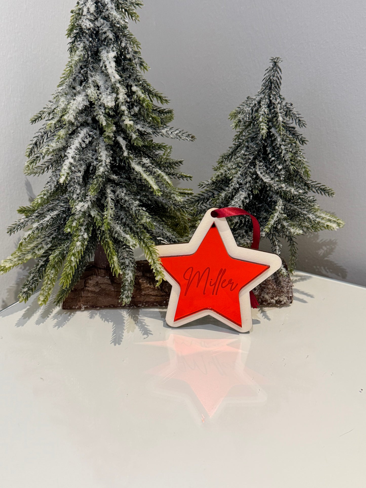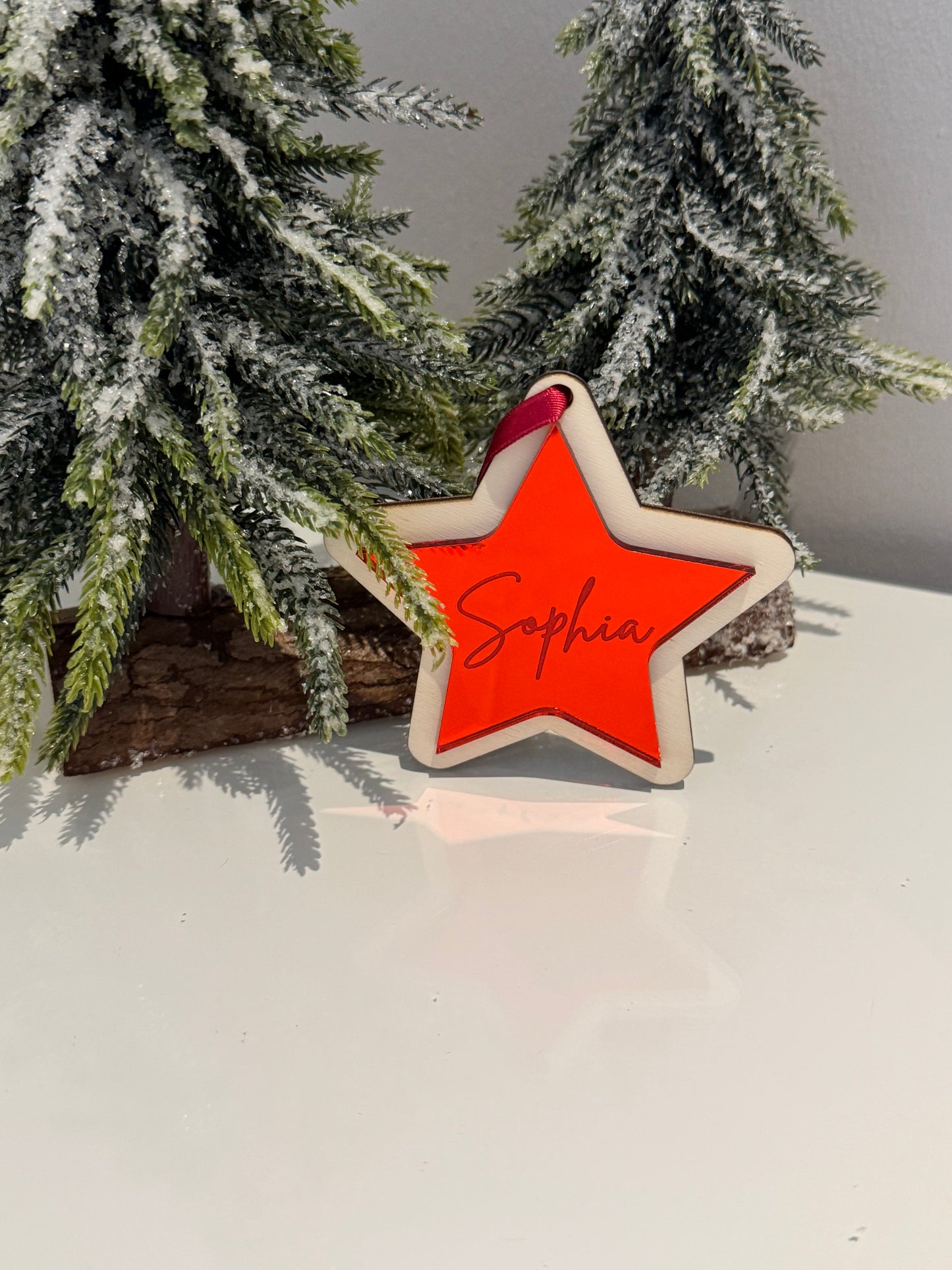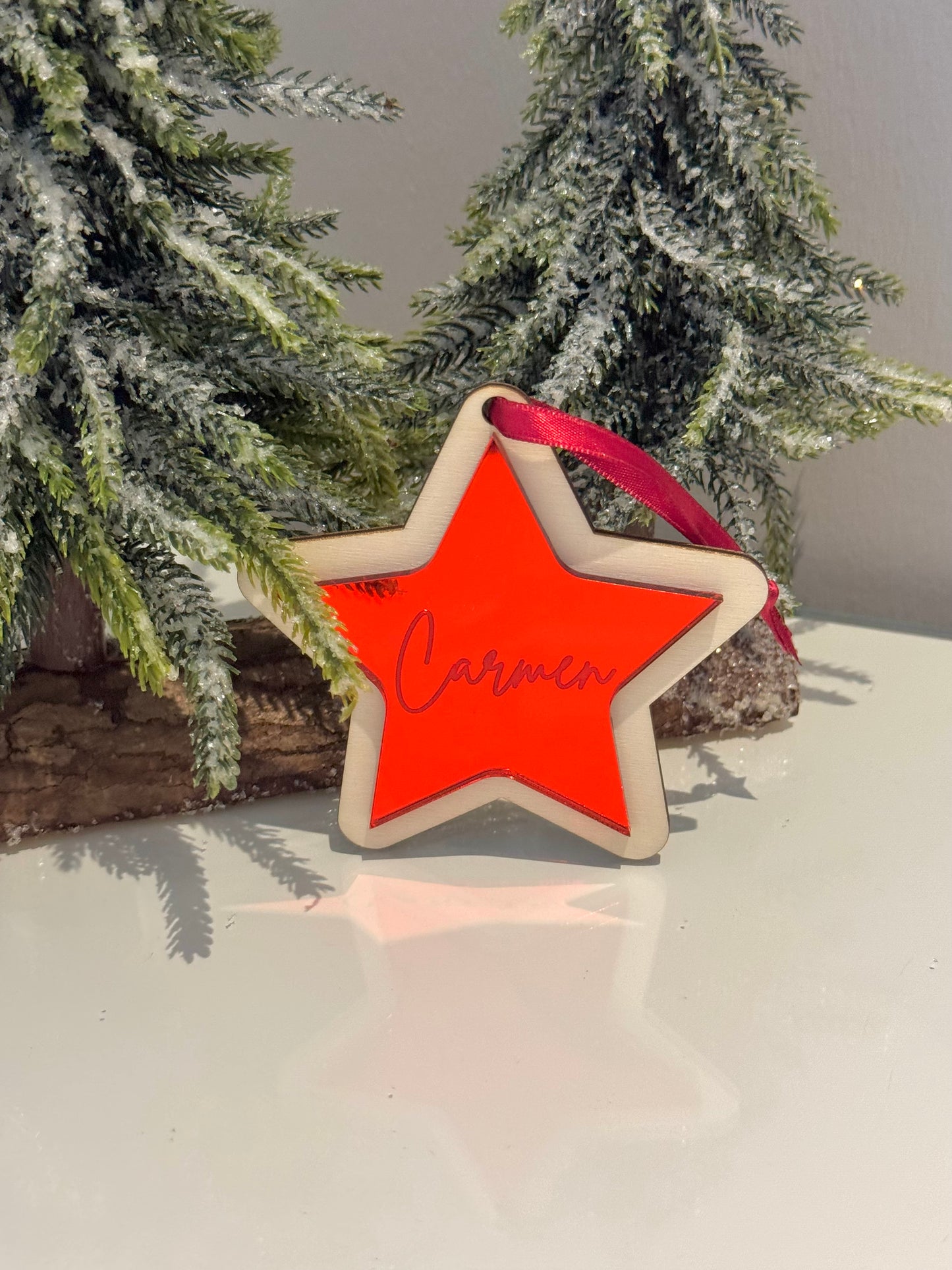 Celebrate Christmas with our stunning personalised acrylic star decoration! stylish mirrored acrylic star with a wooden backing, creating a lovely contrast that will stand out on any Christmas tree.