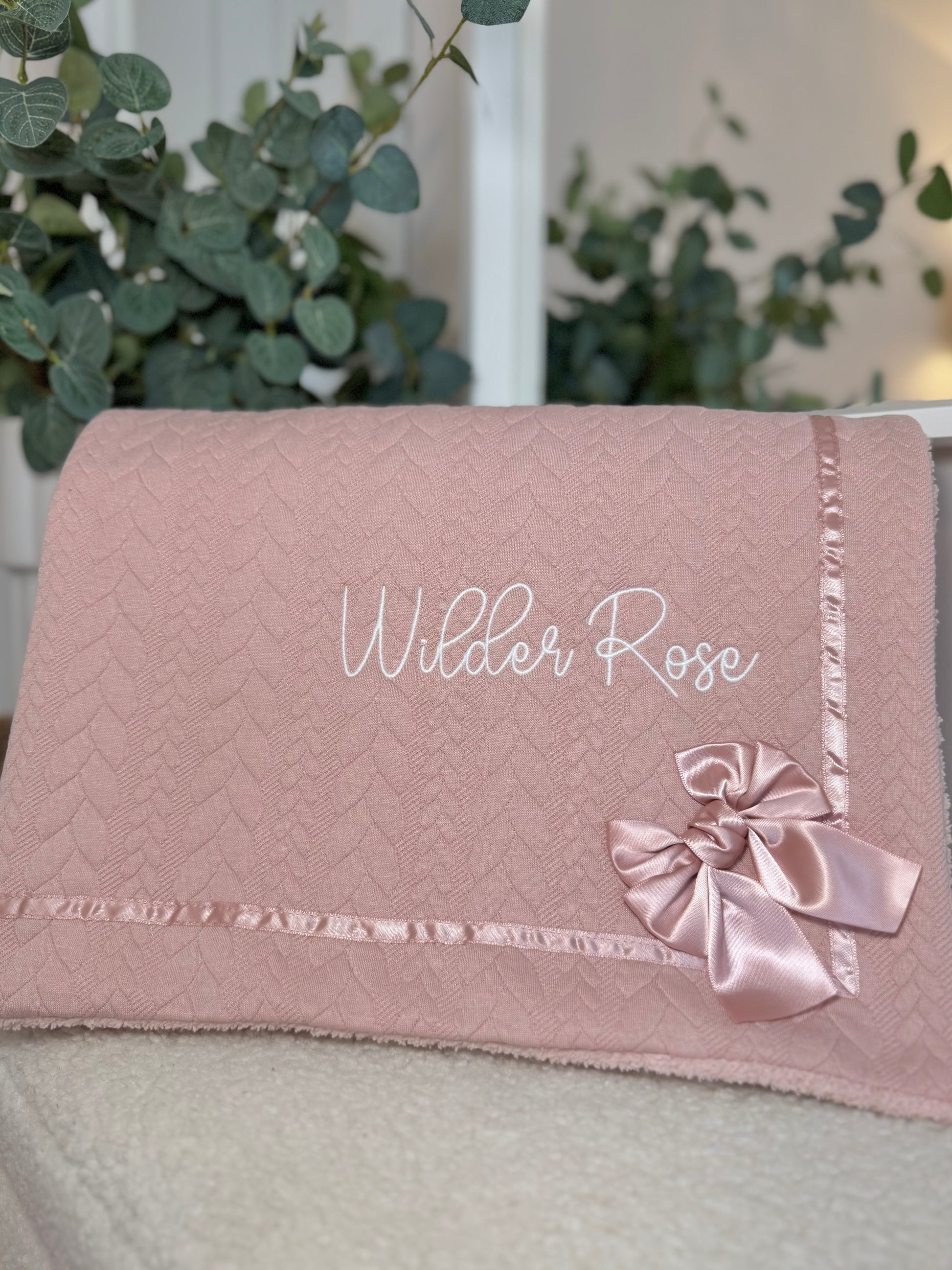 🧸Introducing our personalised cable-knit baby wraps, complete with satin bow. They’re the perfect addition to any nursery! Made from soft and cosy material, this swaddle is perfect for snuggling up with your little one. Our baby wrap is made with both style and practicality in mind. The swaddles are machine washable, making them easy to keep clean and looking great, even after multiple washes. The soft and durable material ensures that your baby will stay comfortable and warm, whether they are napping in their crib or being carried around on-the-go. They feature a cable-knit front and cosy Sherpa back, with a sweet satin bow in the lower corner.