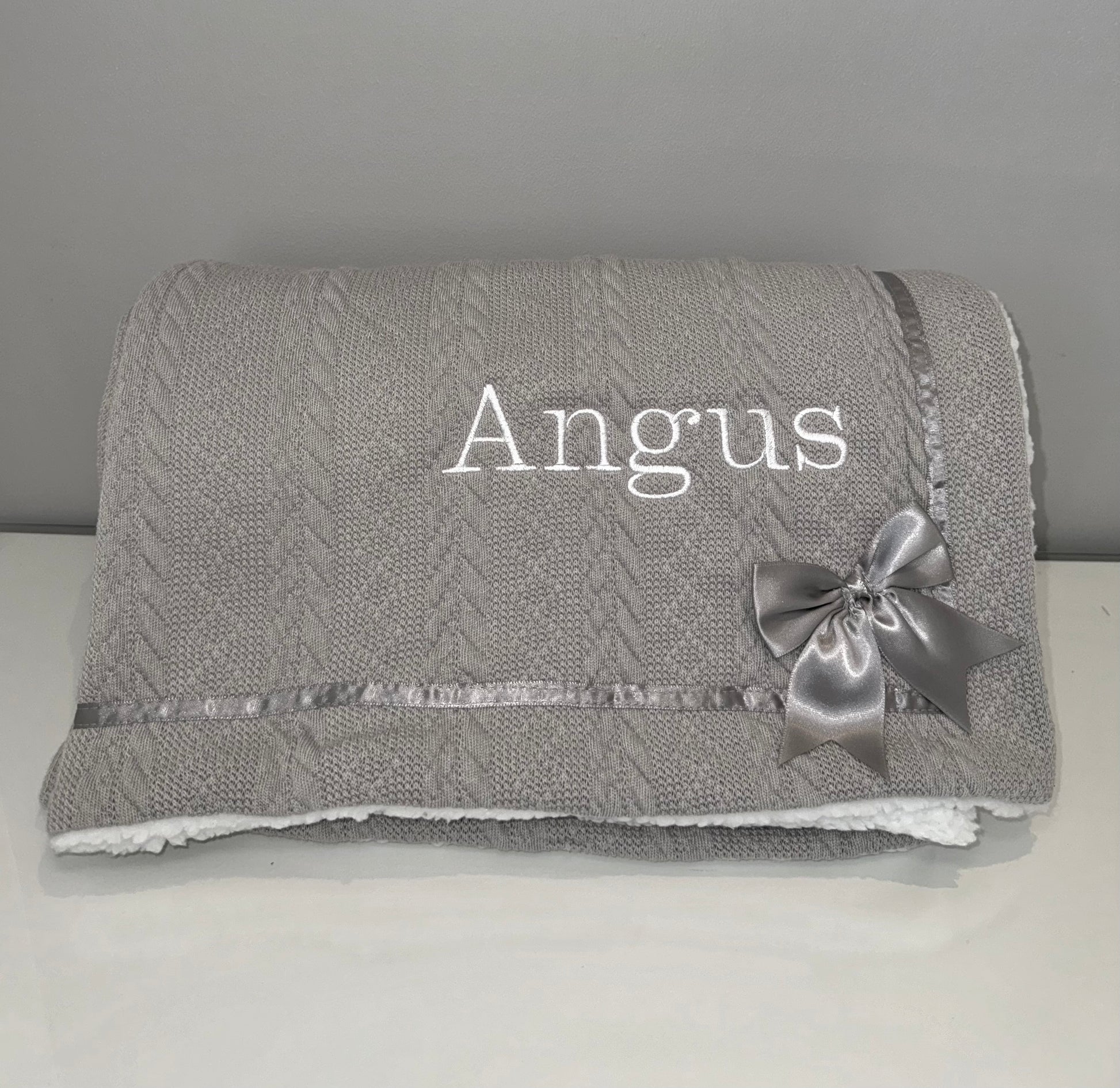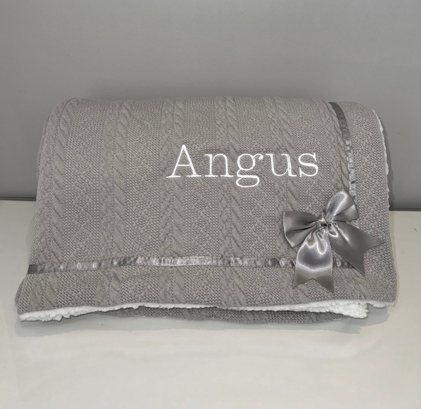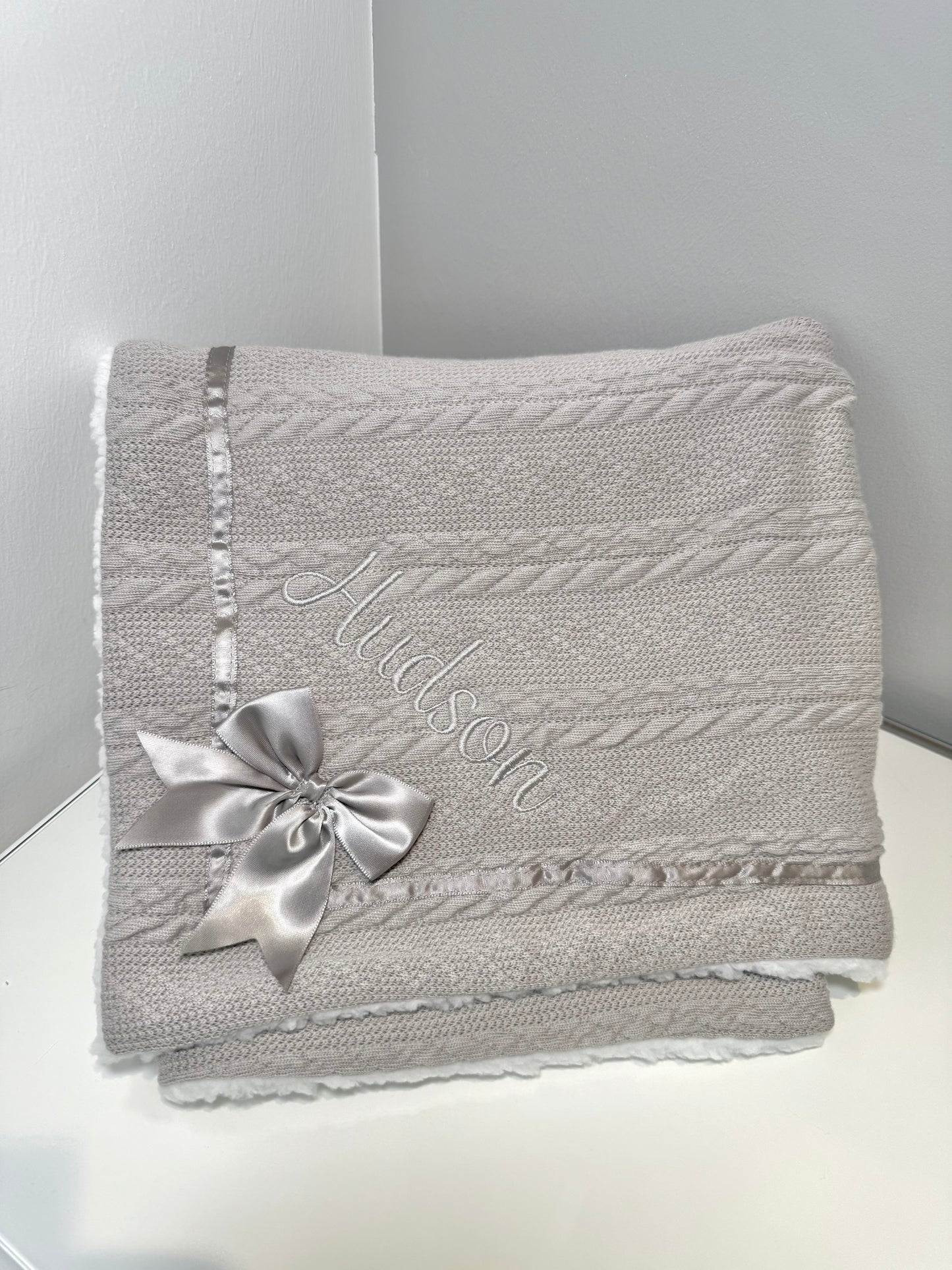 🧸Introducing our personalised cable-knit baby wraps, complete with satin bow. They’re the perfect addition to any nursery! Made from soft and cosy material, this swaddle is perfect for snuggling up with your little one. Our baby wrap is made with both style and practicality in mind. The swaddles are machine washable, making them easy to keep clean and looking great, even after multiple washes. The soft and durable material ensures that your baby will stay comfortable and warm, whether they are napping in their crib or being carried around on-the-go. They feature a cable-knit front and cosy Sherpa back, with a sweet satin bow in the lower corner.